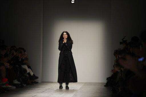 Fashion designer Isabel Benenato acknowledges the audience's applause at the end of her men's Fall-Winter 2019-20 fashion show, that was presented in Milan, Italy, Monday, Jan. 14, 2019. (AP Photo/Luca Bruno)