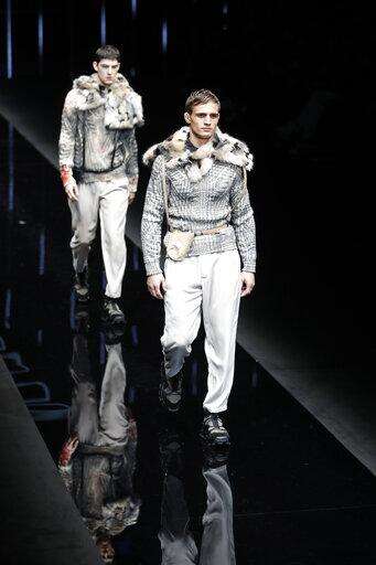 Designer Giorgio Armani wrapped men in shaggy synthetic fur and lined coats with warm lambskin, an interpretation of another era's animal fur capes he says was inspired by the natural world.
