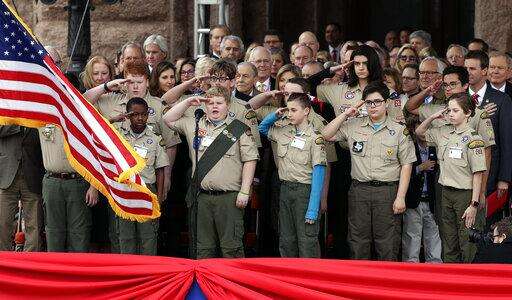 Scouts from Longview, Texas, lead in the Pledge of Allegiance during the inauguration ceremony for Texas Gov. Greg Abbott and Texas Lt. Gov. Dan Patrick, in Austin, Texas, Tuesday, Jan. 15, 2019. (AP Photo/Eric Gay) The Associated Press