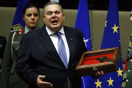 Outgoing Defense Minister Panos Kammenos receives a gift from military personnel during the handover ceremony in Athens, Tuesday, Jan. 15, 2019. Newly appointed Defense Minister Evangelos Apostolakis retired admiral left his post as head of the country's armed forces to replace Panos Kammenos, leader of a small nationalist party, who withdrew from the government coalition at the weekend over disagreement on a proposed deal between Greece and neighbor Macedonia. Greece's parliament has scheduled a confidence vote for late Wednesday following the collapse of Prime Minister Alexis Tsipras' governing coalition over a proposed deal to end a decades-old dispute with Macedonia. (AP Photo/Thanassis Stavrakis) The Associated Press