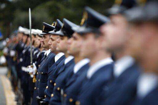 The guard of honor stand during the handover ceremony at the Defense Ministry in Athens, Tuesday, Jan. 15, 2019. during the handover ceremony in Athens, Tuesday, Jan. 15, 2019. Newly appointed Defense Minister Evangelos Apostolakis retired admiral left his post as head of the country's armed forces to replace Panos Kammenos, leader of a small nationalist party, who withdrew from the government coalition at the weekend over disagreement on a proposed deal between Greece and neighbor Macedonia. Greece's parliament has scheduled a confidence vote for late Wednesday following the collapse of Prime Minister Alexis Tsipras' governing coalition over a proposed deal to end a decades-old dispute with Macedonia. (AP Photo/Thanassis Stavrakis) The Associated Press