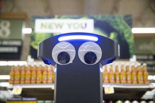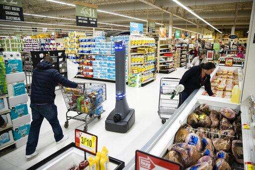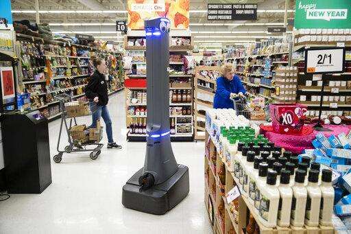 A robot named Marty cleans the floors at a Giant grocery store in Harrisburg, Pa., Tuesday, Jan. 15, 2019. On Monday, the Carlisle-based Giant Food Stores announced new robotic assistants will be arriving at all 172 Giant stores by the middle of this year. The chain's parent company says it plans to eventually deploy the robots to nearly 500 stores. (AP Photo/Matt Rourke)