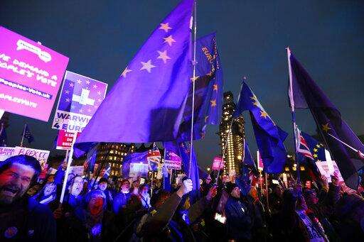Protesters seeking a new referendum on Britain's membership in the bloc are waving blue-and-yellow EU flags.