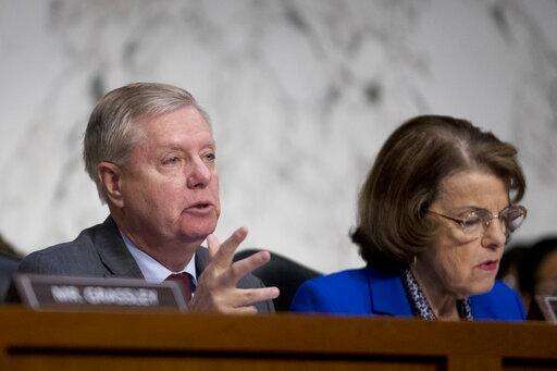 Senate Judiciary Committee Chairman Lindsey Graham, R-S.C., accompanied by Ranking Member Sen. Dianne Feinstein, D-Calif., right, questions Attorney General nominee William Barr during a Senate Judiciary Committee hearing on Capitol Hill in Washington, Tuesday, Jan. 15, 2019. Barr will face questions from the Senate Judiciary Committee on Tuesday about his relationship with Trump, his views on executive powers and whether he can fairly oversee the special counsel's Russia investigation. Barr served as attorney general under George H.W. Bush. (AP Photo/Andrew Harnik) The Associated Press
