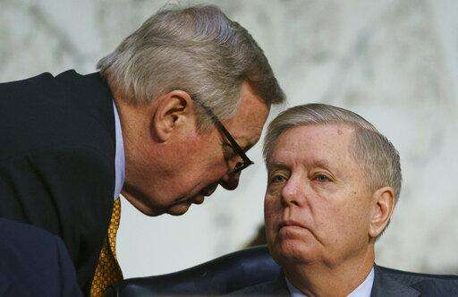 Senate Judiciary Committee Chairman Lindsey Graham, R-S.C., left, speaks committee member Sen. Dick Durbin, D-Ill., as Attorney General nominee William Barr testifies before the Senate Judiciary Committee on Capitol Hill in Washington, Tuesday, Jan. 15, 2019. (AP Photo/Carolyn Kaster) The Associated Press
