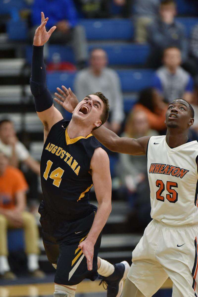 Augustana's Pierson Wofford hauls in a rebound against Wheaton College's Trevor Gunter in a men's basketball game in Wheaton Wednesday. John Starks/jstarks@dailyherald.com