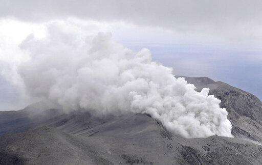 A smoke column rises from Shindake volcano after its eruption in Kuchinoerabu island, southern Japan, Thursday, Jan. 17, 2019. Japan Meteorological Agency said Thursday's eruption caused volcanic rocks flying out of the crater and pyroclastic flows pouring down but have not reached as far as the residential area 2 kilometers (1.2 mile) away. (Kyodo News via AP)