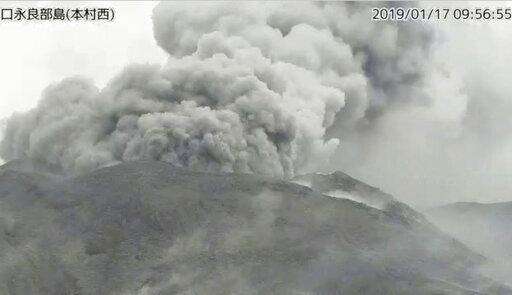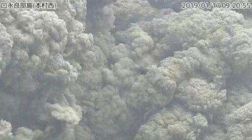 A smoke column rises from Shindake volcano after its eruption in Kuchinoerabu island, southern Japan, Thursday, Jan. 17, 2019. Japan Meteorological Agency said the eruption caused volcanic rocks flying out of the crater and pyroclastic flows pouring down but have not reached as far as the residential area 2 kilometers (1.2 mile) away. (Kyodo News via AP)