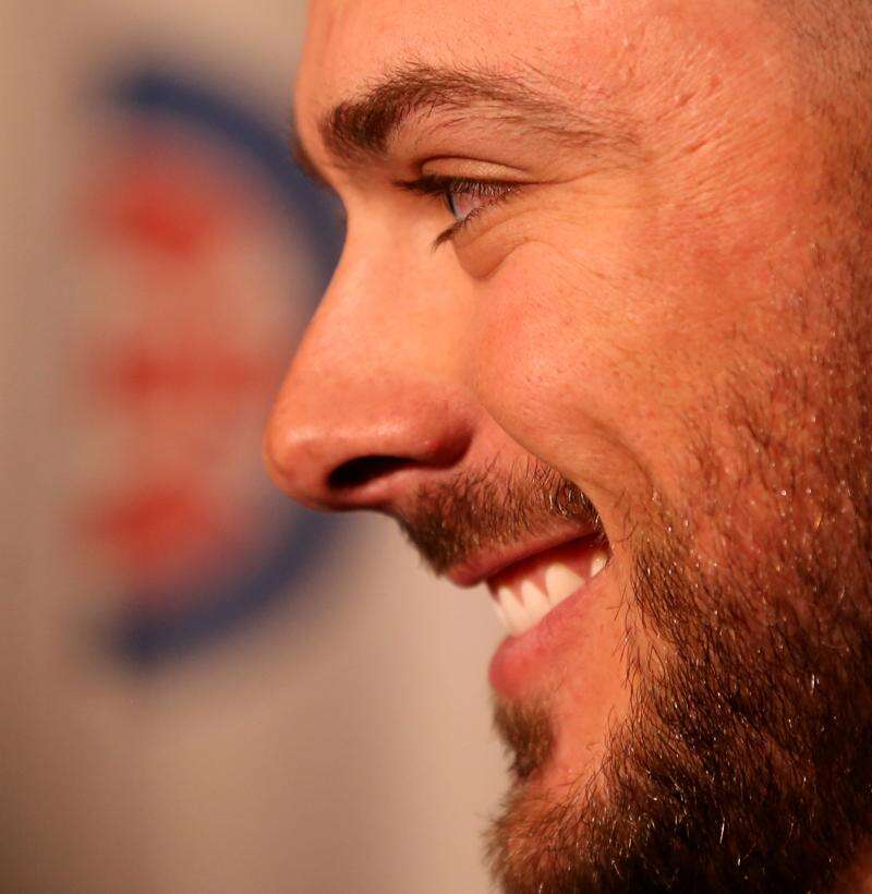Javier Baez speaks to the media during opening night Friday of the 2019 Chicago Cubs Convention at the Sheraton Grand in Chicago.