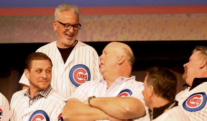 Joe Maddon shares a laugh with former players including Tim Stoddard during opening night Friday of the 2019 Chicago Cubs Convention at the Sheraton Grand in Chicago.