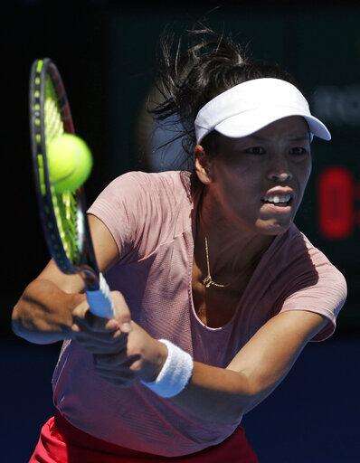 Taiwan's Hsieh Su-Wei makes a backhand return to Japan's Naomi Osaka during their third round match at the Australian Open tennis championships in Melbourne, Australia, Saturday, Jan. 19, 2019. (AP Photo/Kin Cheung)