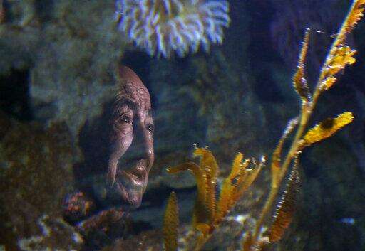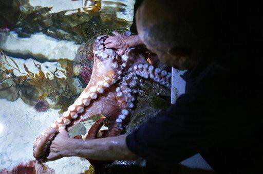 BOSTON (AP) - Wilson Menashi palmed a squid in his left hand and extended his arm into an aquarium tank, watching as a giant Pacific octopus stretched out arms to greet him like a friend.