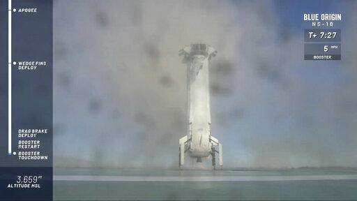 In this image from video made available by Blue Origin, the New Shepard booster lands the company's site in west Texas. Jeff Bezos' rocket company launched NASA experiments into space on the brief test flight. (Blue Origin via AP) The Associated Press