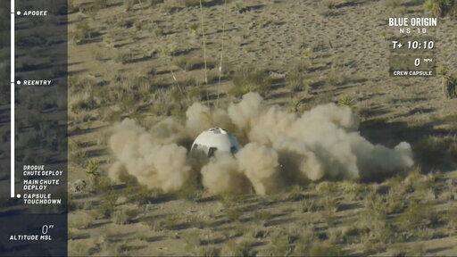 In this image from video made available by Blue Origin, the New Shepard capsule lands at the company's site in west Texas. Jeff Bezos' rocket company launched NASA experiments into space on the brief test flight. (Blue Origin via AP) The Associated Press
