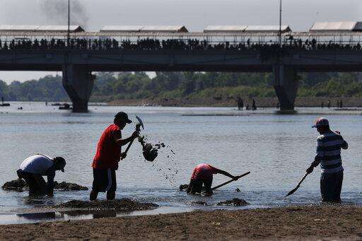 Workers clean the Suchiate River on the border between Guatemala and Mexico as Central American migrants wait to their migration issues at the bridge, top, near Ciudad Hidalgo, Chiapas State, Mexico, Saturday, Jan. 19, 2019. Hundreds of Central American migrants are walking and hitchhiking through the region as part of a new caravan of migrants hoping to reach the United States. (AP Photo/Marco Ugarte) The Associated Press