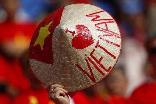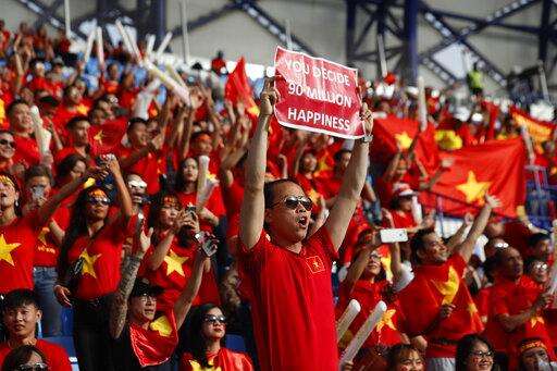 Vietnam's soccer team supporters cheer ahead of the AFC Asian Cup quarterfinal soccer match between Japan and Vietnam at Al Maktoum Stadium in Dubai, United Arab Emirates, Thursday, Jan. 24, 2019. (AP Photo/Hassan Ammar)