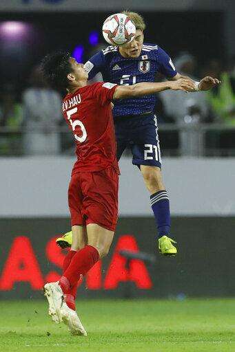 Japan's forward Koya Kitagawa, right, goes for the ball past Vietnam's defender Bui Then Dungi during the AFC Asian Cup quarterfinal soccer match between Japan and Vietnam at Al Maktoum Stadium in Dubai, United Arab Emirates, Thursday, Jan. 24, 2019. (AP Photo/Hassan Ammar)