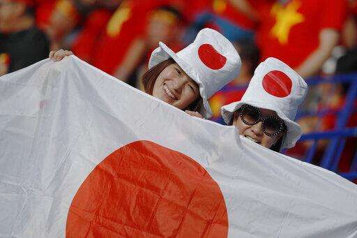 Japan's soccer team supporters smile ahead of the AFC Asian Cup quarterfinal soccer match between Japan and Vietnam at Al Maktoum Stadium in Dubai, United Arab Emirates, Thursday, Jan. 24, 2019. (AP Photo/Hassan Ammar)