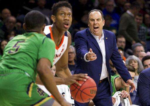 Notre Dame head coach Mike Brey yells to his players as Notre Dame's D.J. Harvey (5) defends against Virginia's De'Andre Hunter during the first half of an NCAA college basketball game Saturday, Jan. 26, 2019, in South Bend, Ind. (AP Photo/Robert Franklin) The Associated Press