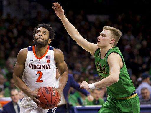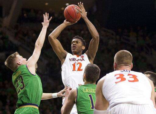 Virginia's De'Andre Hunter (12) goes up for a shot over Notre Dame's Dane Goodwin (23) and Nate Laszewski during the first half of an NCAA college basketball game Saturday, Jan. 26, 2019, in South Bend, Ind. (AP Photo/Robert Franklin) The Associated Press