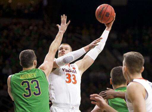 Virginia's Jack Salt, center, goes up for a shot next to Notre Dame's John Mooney, left, during the first half of an NCAA college basketball game Saturday, Jan. 26, 2019, in South Bend, Ind. Virginia won 82-55. (AP Photo/Robert Franklin) The Associated Press