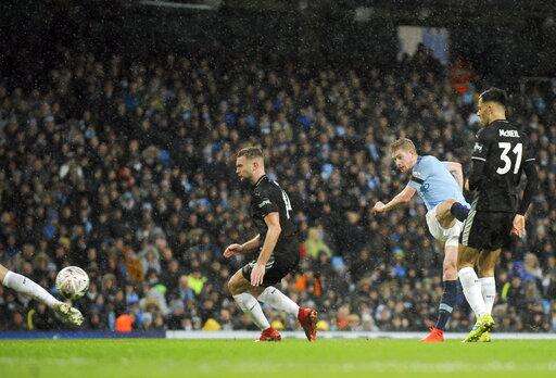 Manchester City's Kevin De Bruyne scores his side's third goal during the English Premier League soccer match between Manchester City and Burnley at Etihad stadium in Manchester, England, Saturday, Jan. 26, 2019. (AP Photo/Rui Vieira) The Associated Press
