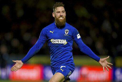 AFC Wimbledon's Scott Wagstaff celebrates scoring the second gaol against West Ham during their English FA Cup fourth round soccer match at Kingsmeadow ground in London, Saturday Jan. 26, 2019. (Daniel Hambury/PA via AP) The Associated Press