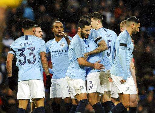 Manchester City's players celebrate after scoring their side's second goal during the English Premier League soccer match between Manchester City and Burnley at Etihad stadium in Manchester, England, Saturday, Jan. 26, 2019. (AP Photo/Rui Vieira) The Associated Press