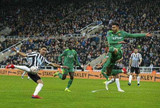 Newcastle United's Ayoze Perez shoots whilst under pressure from Watford's Etienne Capoue, right, in the English FA Cup fourth round match at St James' Park in Newcastle, England, Saturday Jan. 26, 2019. (Ian Hodgson/PA via AP) The Associated Press