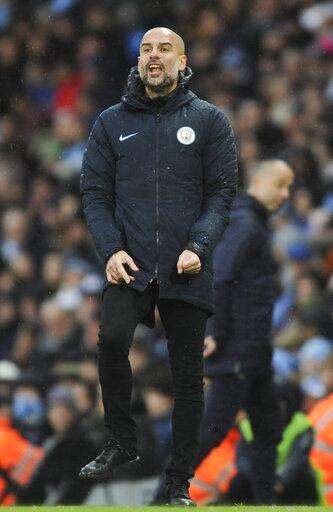 Manchester City manager Josep Guardiola reacts during the FA Cup 4th round soccer match between Manchester City and Burnley at Etihad stadium in Manchester, England, Saturday, Jan. 26, 2019. (AP Photo/Rui Vieira) The Associated Press