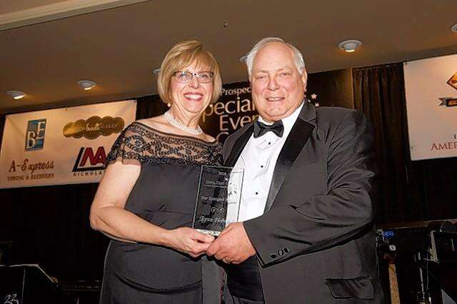 Loren Helwink, who led efforts to create a monument honoring Mount Prospect residents killed while serving the country, received the Star Spangled Banner award from Mayor Arlene Juracek last Saturday during the 26th annual Shining Stars gala. Courtesy of Manfred Pfeifer
