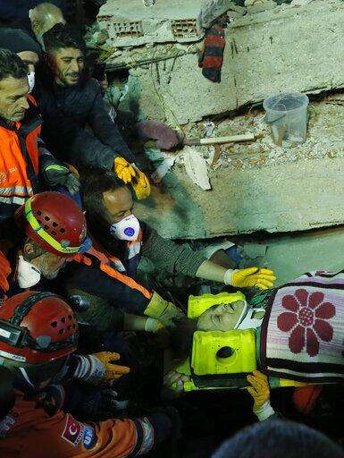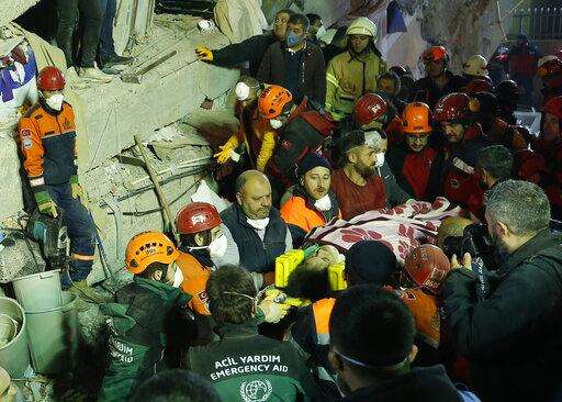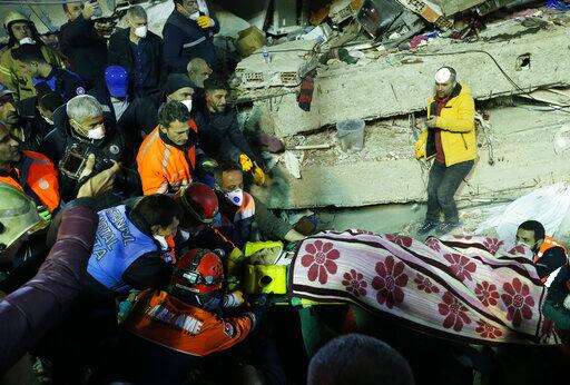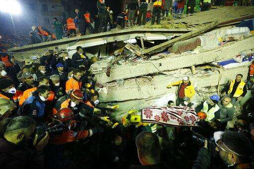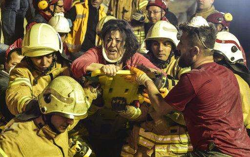 Rescue workers carry a woman from the rubble of an eight-story building which collapsed in Istanbul, Wednesday, Feb. 6, 2019. The eight-story building collapsed, killing at least two people and trapping several others inside the rubble, Turkish officials said. The building had 43 people living in 14 apartments, with a street-level ground floor and seven higher floors, Istanbul Gov. Ali Yerlikaya said, adding that the top three floors had been built illegally.(AP Photo/ Emrah Gurel)