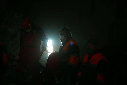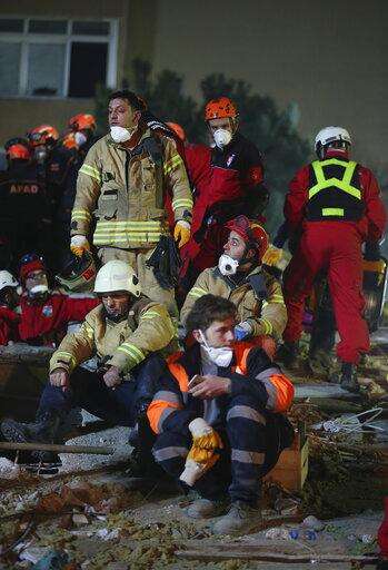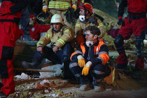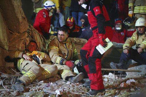 Rescue workers take a break from searching for survivors at the rubble of an eight-story building which collapsed in Istanbul, late Wednesday, Feb. 6, 2019. The eight-story building collapsed, killing at least two people and trapping several others inside the rubble, Turkish officials said. The building had 43 people living in 14 apartments, with a street-level ground floor and seven higher floors, Istanbul Gov. Ali Yerlikaya said, adding that the top three floors had been built illegally.(AP Photo/ Emrah Gurel)