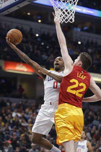 Los Angeles Clippers' Sindarius Thornwell (0) shoots against Indiana Pacers' T.J. Leaf (22) during the first half of an NBA basketball game Thursday, Feb. 7, 2019, in Indianapolis. (AP Photo/Darron Cummings) The Associated Press