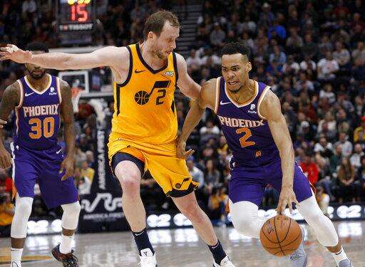 Phoenix Suns' Elie Okobo (2), right, drives to the basket as Utah Jazz's Joe Ingles (2) defends in the first half of an NBA basketball game on Wednesday, Feb. 6, 2019, in Salt Lake City. (AP Photo/Kim Raff) The Associated Press