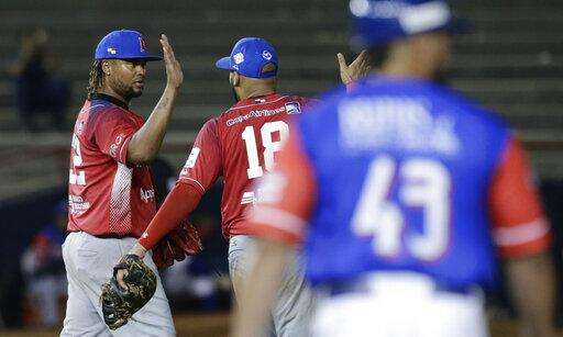 Closing pitcher Manny Corpas of Panama's Los Toros de Herrera celebrates his team's victory over Puerto Rico's Cangrejeros de Santurce after a Caribbean Series baseball game at Rod Carew stadium in Panama City, Wednesday, Feb. 6, 2019. (AP Photo/Arnulfo Franco) The Associated Press