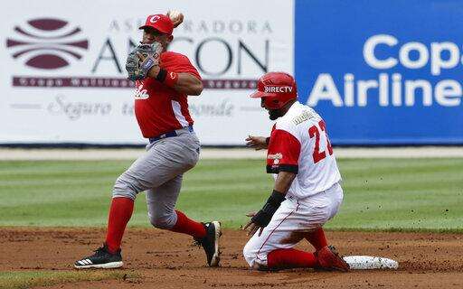 Third baseman Carlos Rivero of Venezuela's Cardenales de Lara fails to catch the ball during a Caribbean Series baseball game against Cuba's Los Leneros de las Tunas at Rod Carew stadium in Panama City, Wednesday, Feb. 6, 2019. (AP Photo/Arnulfo Franco) The Associated Press