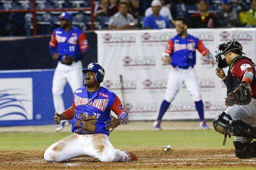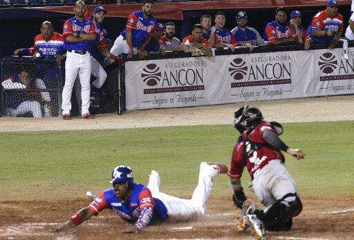 Puerto Rico's Cangrejeros de Santurce players watch teammate Brian Navarreto slide safely home during the sixth inning of a Caribbean Series baseball game against Panama's Los Toros de Herrera at Rod Carew stadium in Panama City, Wednesday, Feb. 6, 2019. (AP Photo/Arnulfo Franco) The Associated Press