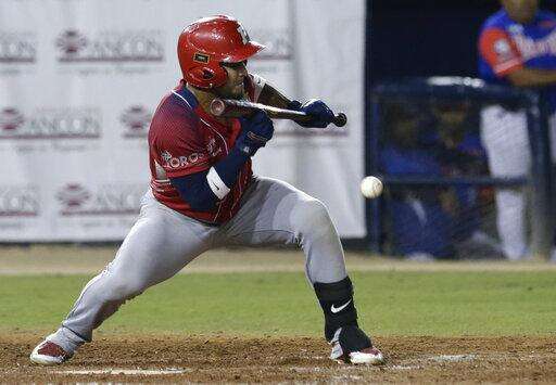 Jonathan Galvez of Panama's Los Toros de Herrera bats against Puerto Rico's Cangrejeros de Santurce during the ninth inning of a Caribbean Series baseball game game Rod Carew stadium in Panama City, Wednesday, Feb. 6, 2019. (AP Photo/Arnulfo Franco) The Associated Press