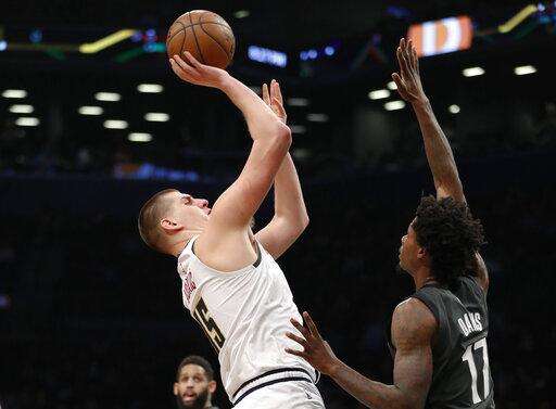 Denver Nuggets center Nikola Jokic (15) shoots as Brooklyn Nets forward Ed Davis (17) defends during the first half of an NBA basketball game Wednesday, Feb. 6, 2019, in New York. (AP Photo/Kathy Willens) The Associated Press