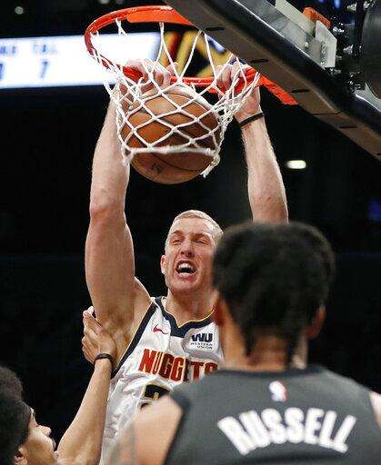 Nuggets: Plumlee was 7 for 7 in the first quarter. ... Gary Harris missed his fourth consecutive game with a strained right groin. Paul Millsap missed his second straight with right ankle soreness. ... Malone, a New York native, said his parents would be at the game. His father, Brendan, coached 28 years in the NBA.