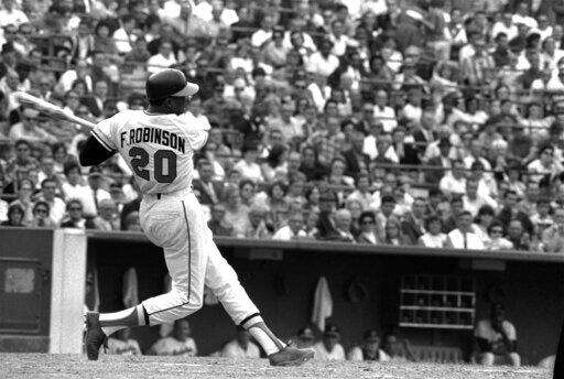 FILE -This is a May 19, 1966, file photo showing Baltimore Orioles' Frank Robinson at bat. Hall of Famer Frank Robinson, the first black manager in Major League Baseball and the only player to win the MVP award in both leagues, has died. He was 83. Robinson had been in hospice care at his home in Bel Air. MLB confirmed his death Thursday, Feb. 7, 2019.(AP Photo/File) The Associated Press