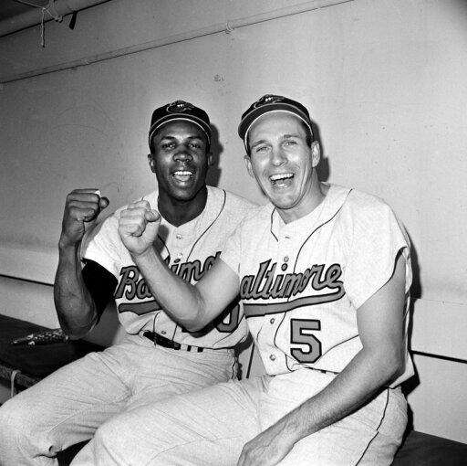 FILE - In this Oct. 5, 1966, file photo, Baltimore Orioles teammates Frank Robinson, left, and Brooks Robinson pose after leading the Baltimore Orioles to a 5-2 win in the opening game of the World Series against the Los Angeles Dodgers, in Los Angeles. Hall of Famer Frank Robinson, the first black manager in Major League Baseball and the only player to win the MVP award in both leagues, has died. He was 83. Robinson had been in hospice care at his home in Bel Air. MLB confirmed his death Thursday, Feb. 7, 2019.(AP Photo/File) The Associated Press