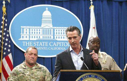 California Gov. Gavin Newsom, center, discusses his decision to withdraw several hundred National Guard troops from the nation's southern border and changing their mission, during a Capitol news conference Monday, Feb. 11, 2019, in Sacramento, Calif. Newsom, flanked by Major General David Baldwin, the Adjutant General of the California Military Department, left, and California Highway Patrol Commissioner Warren Stanley, right, said he will order the troops to leave by the end of March but will leave 100 troops to focus on drug trafficking. (AP Photo/Rich Pedroncelli) The Associated Press