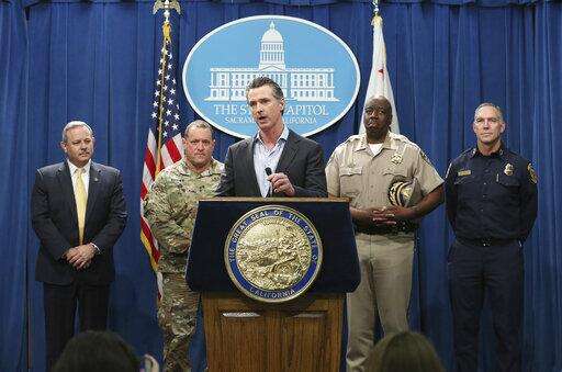 California Gov. Gavin Newsom, center, discusses his decision to withdraw several hundred National Guard troops from the nation's southern border and changing their mission, during a Capitol news conference Monday, Feb. 11, 2019, in Sacramento, Calif. Newsom, accompanied by from left, Mark Ghilarducci, director of the California Governor's Office of Emergency Services, Maj. Gen. David Baldwin, the Adjutant General of the California Military Department, Warren Stanley, Commissioner of the California Highway Patrol, right, and Thom Porter, director of the California Department of Forestry and Fire Protection, right, said he will order the troops to leave by the end of March but will leave 100 troops to focus on drug trafficking. (AP Photo/Rich Pedroncelli) The Associated Press