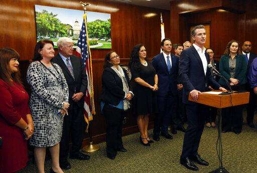 FILE - In this Jan. 17, 2019 file photo, Gov. Gavin Newsom speaks at the California Legislative Black Caucus Martin Luther King Jr., Breakfast, in Sacramento, Calif. Newsom is withdrawing several hundred National Guard troops from the nation's southern border and changing their mission. (AP Photo/Rich Pedroncelli, File) The Associated Press