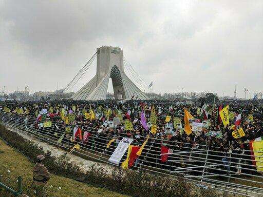 TEHRAN, Iran (AP) - Waving Iranian flags, chanting "Death to America" and burning U.S. and Israeli flags, hundreds of thousands of people poured out onto the streets across Iran on Monday, marking the date that's considered victory day in the country's 1979 Islamic Revolution.