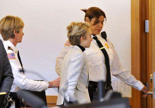 Michelle Carter, 22, center, is led away by court officers after a hearing on her prison sentence in Taunton District Court in Taunton, Mass. Monday, February 11, 2019. Carter was jailed Monday on an involuntary manslaughter conviction. She was convicted in 2017 of involuntary manslaughter and sentenced to a 15 month prison term for encouraging 18-year-old Conrad Roy, III to kill himself when she instructed him over the phone to get back in his truck that was filling with toxic gas in July 2014. (Mark Stockwell/The Sun Chronicle via AP, Pool)