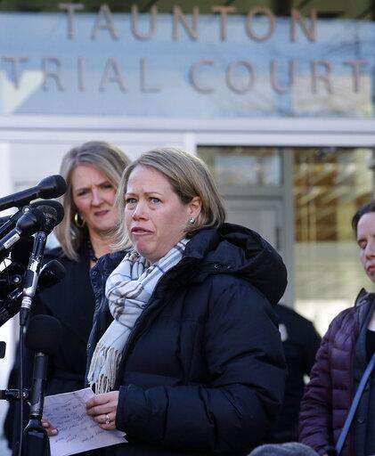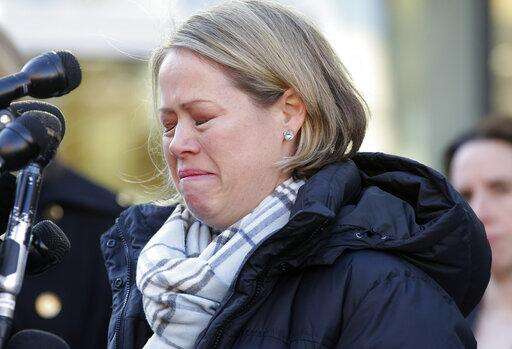 Becky Maki, aunt of texting suicide victim Conrad Roy III, is emotional as she faces reporters outside Taunton District Court, in Taunton, Mass., following a hearing Monday, Feb. 11, 2019 where defendant Michelle Carter's 15-month prison term was upheld. Carter, who sent her suicidal boyfriend a barrage of text messages urging him to kill himself was jailed Monday on an involuntary manslaughter conviction nearly five years after he died in a truck filled with toxic gas. (AP Photo/Steven Senne)