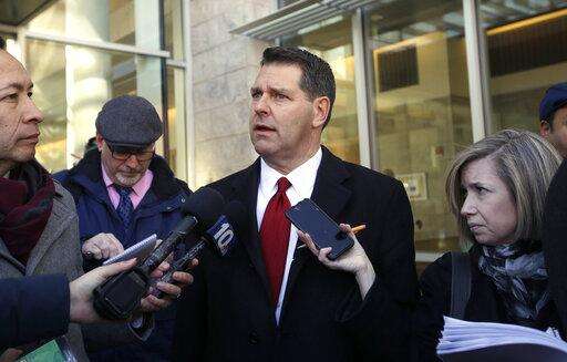 Joe Cataldo, center, defense attorney for Michelle Carter, faces reporters outside Taunton District Court, in Taunton, Mass., following a hearing Monday, Feb. 11, 2019 where Carter's 15-month prison term was upheld. Carter, who sent her suicidal boyfriend Conrad Roy III a barrage of text messages urging him to kill himself, was jailed Monday on an involuntary manslaughter conviction nearly five years after he died in a truck filled with toxic gas. (AP Photo/Steven Senne)